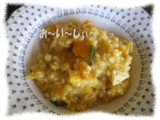 発芽玄米かぼちゃ雑炊+きのこ、おあげみ じん切り+太白ごま油。天然醸造味噌を香 り程度に。強肝、皮膚・粘膜を丈夫にするよ うです |