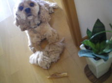 | お留守番の時は特別なおやつ。牛アキレス をもらえます。「ルス」という単語を聞いただ けでテンションアップ。留守番はおいしい。 |
