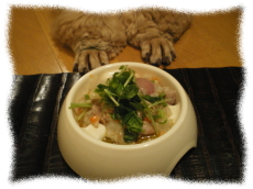 発芽玄米鶏粥+昆布+ローズヒップ+深 煎りごま油。鶏皮からのコラーゲン吸収を 良くするRヒップ。ワンコにも甲状腺の病気 は多いです、予防!昆布でヨウ素を摂取。 |