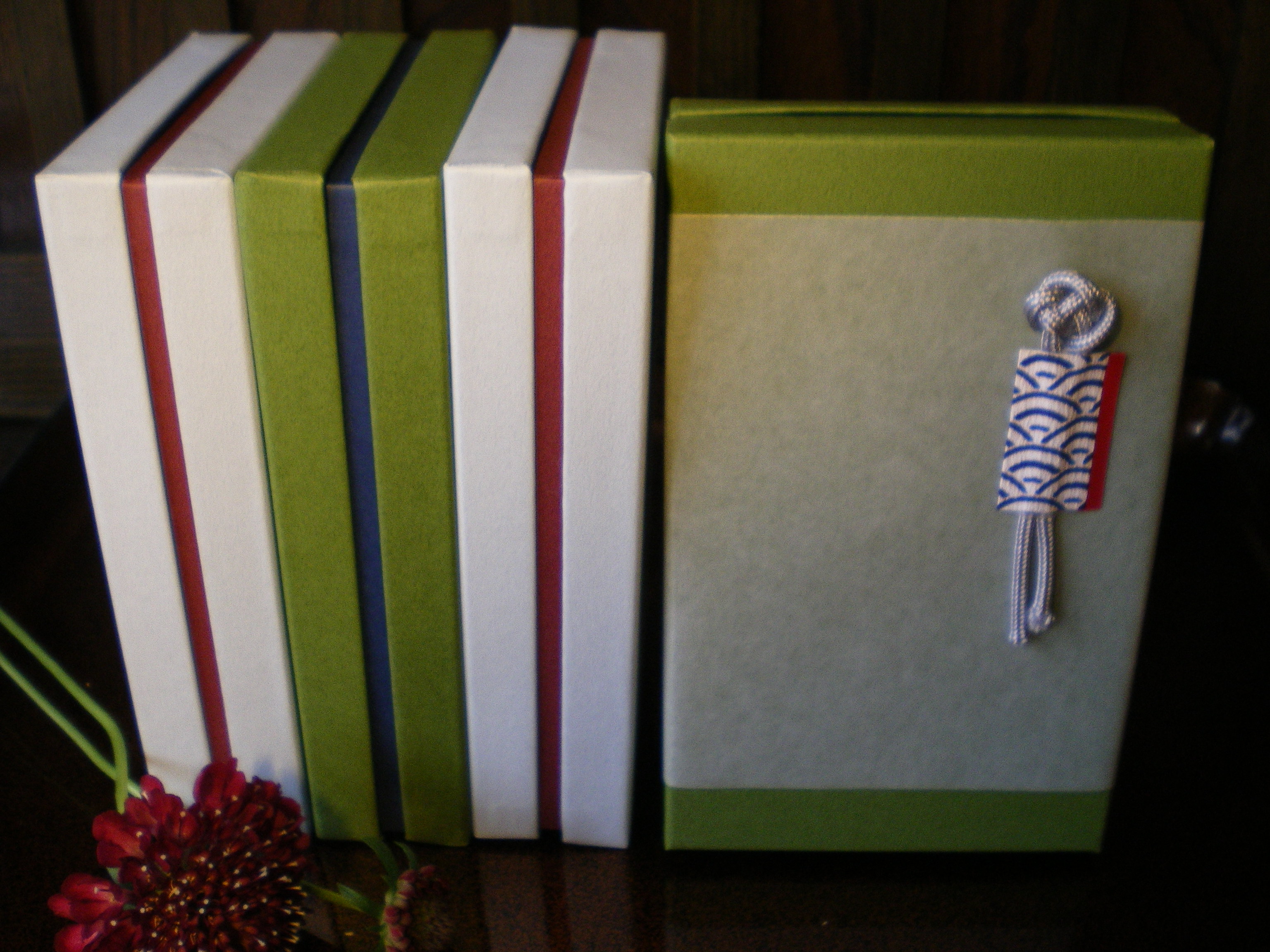 | ・2個入り用ギフト箱 2色 水色×えんじ 抹茶×紺 1個 ¥250(+税) ご希望の色をご指定ください。 結び飾り熨斗、別途料金(\100)にて承ります。 |